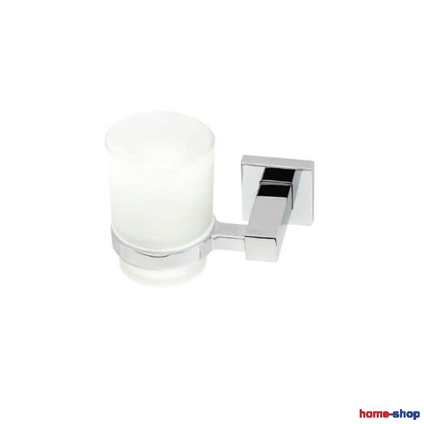 Ποτηροθήκη Μπάνιου με γυάλινο δοχείο με τετράγωνη ροζέτα σε Χρώμιο. Το υλικό της κατασκευής είναι Zamak. Περιλαμβάνονται βίδες και ούπα στήριξης.