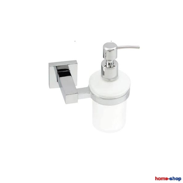 Dispenser Μπάνιου με γυάλινο δοχείο και τετράγωνη ροζέτα σε Χρώμιο. Το υλικό της κατασκευής είναι Zamak. Περιλαμβάνονται βίδες και ούπα στήριξης.