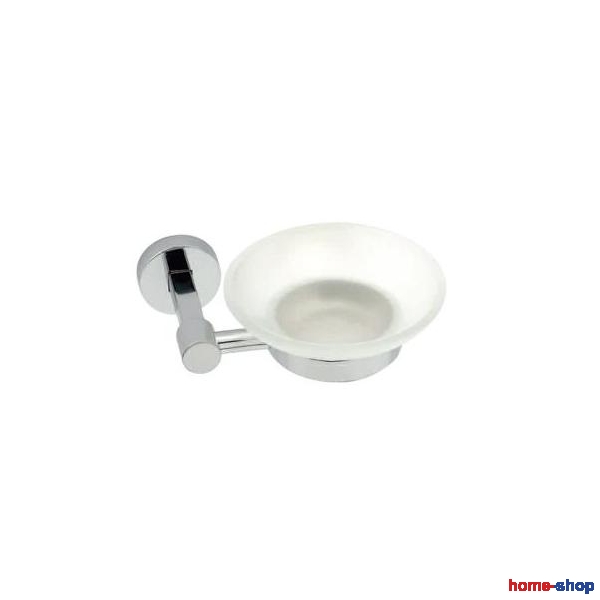 Σαπουνοθήκη Μπάνιου με γυάλινο δοχείο με στρογγυλή ροζέτα σε Χρώμιο. Το υλικό της κατασκευής είναι Zamak. Περιλαμβάνονται βίδες και ούπα στήριξης.