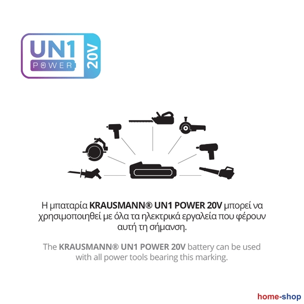 Η μπαταρία KRAUSMANN® UN1 POWER 20V μπορεί να χρησιμοποιηθεί με όλα τα ηλεκτρικά εργαλεία που φέρουν αυτή τη σήμανση.