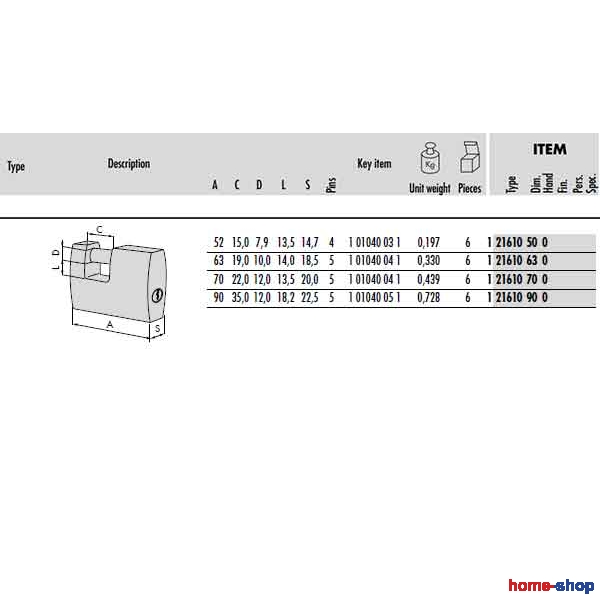 Λουκέτο Ορειχάλκινο Τάκου CISA 21610 σε διαστάσεις (mm) 63, 70, 90