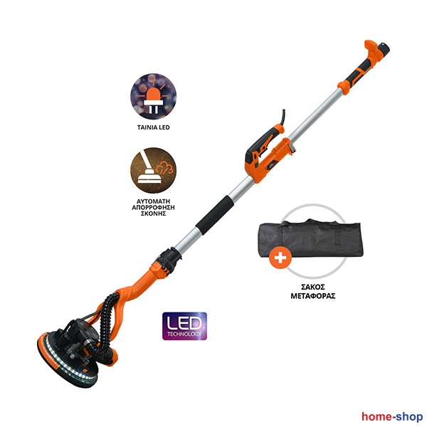 ο τριβείο τοίχου τύπου “Καμηλοπάρδαλη” KRAUSMANN® 9121 είναι ένα υψηλής ισχύος επαγγελματικό εργαλείο, ειδικά σχεδιασμένο για λείανση σε τοίχους και οροφές, ακόμα και στα πιο δύσκολα σημεία. Ενσωματώνει ηλεκτρική σκούπα για απορρόφηση της σκόνης κατά τη χρήση, προσφέροντας καθαρό και υγιεινό περιβάλλον εργασίας. Η διπλή LED ταινία φωτίζει αποτελεσματικά το σημείο επαφής, εξασφαλίζοντας τέλειο οπτικό έλεγχο. Διαθέτει τηλεσκοπικό σωλήνα με εύκολη ρύθμιση ύψους, ιδανικό για εργασίες σε ύψος χωρίς σκάλα. Η αποσπώμενη βάση 1/3 επιτρέπει πρόσβαση σε δύσκολα σημεία, όπως γωνίες και ακμές. Η σύγχρονη καινοτομία χωρίς βουρτσάκι προσφέρει τέλειο και γρήγορο αποτέλεσμα χωρίς γραμμές, με ελάχιστο κόπο, αποφεύγοντας τη δημιουργία κοιλωμάτων στις επιφάνειες εργασίας. Ιδανικό για επαγγελματίες σοβατζήδες, βαφείς και κατασκευαστές που αναζητούν γρήγορα, ποιοτικά και εργονομικά αποτελέσματα.
